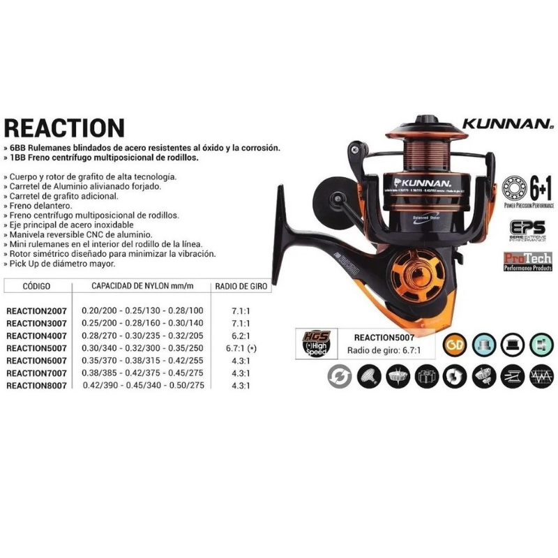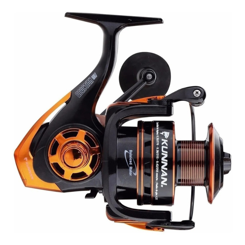 Reel Kunnan frontal con freno mecánico, centrífugo delantero, con rotor simétrico diseñado para minimizar la vibración.