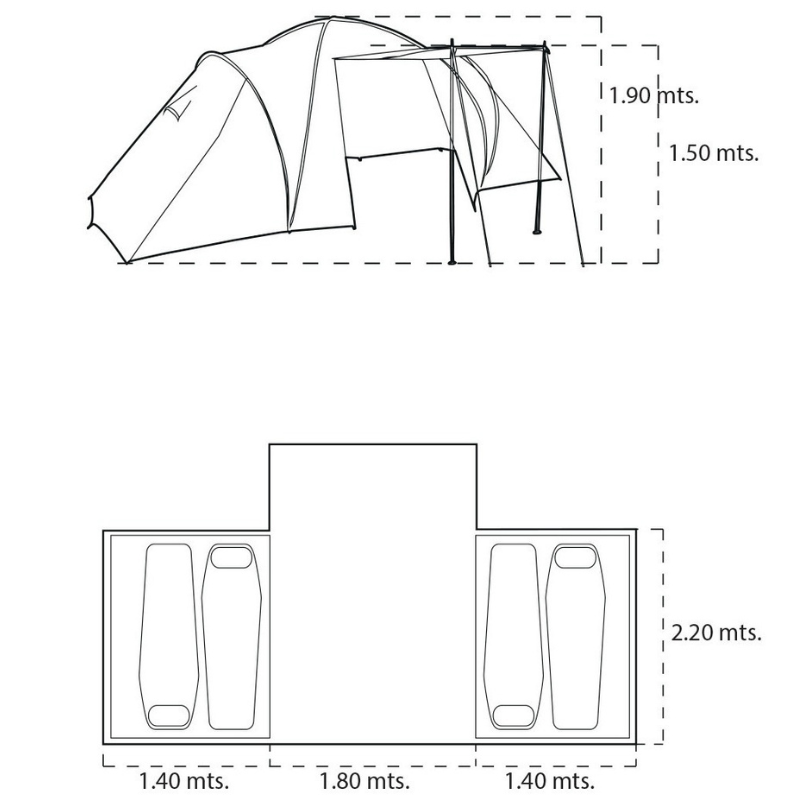 Consta de dos habitaciones separadas y un amplio comedor central con piso, ideal para disfrutar tanto de día como de noche. Su estructura está pensada para resistir distintos tipos de clima y viento. Es fácil de armar y desarmar, proporcionando comodidad y protección en tus aventuras al aire libre.