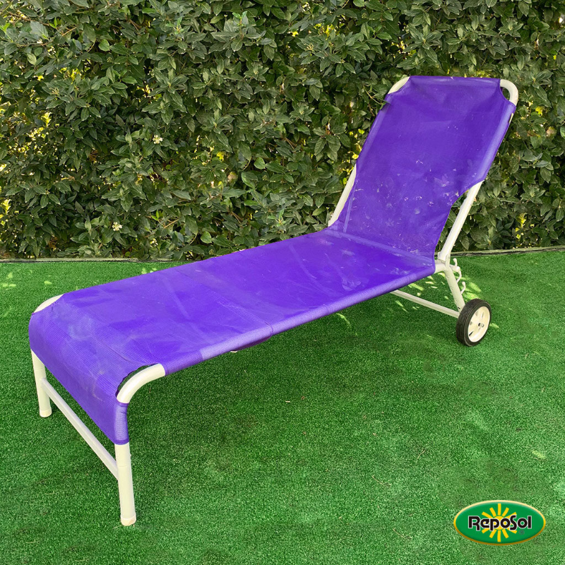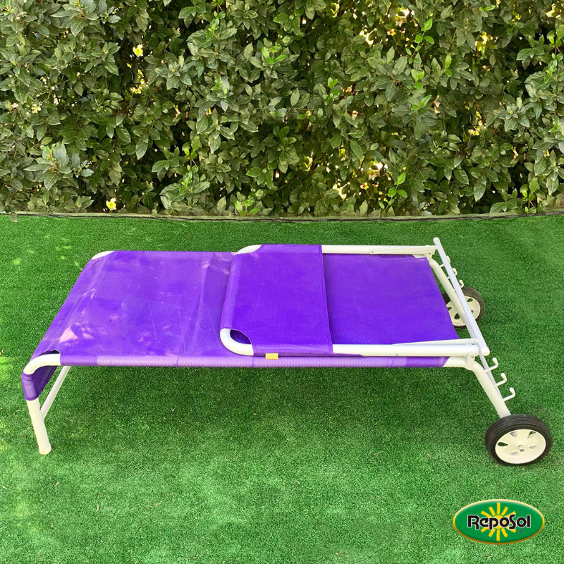 Reposera con ruedas desarmable, estructura de hierro y de tela microperforada. Ideal para descansar bajo el sol. Fácil de armar y desarmar, tela cambiable y lavable.