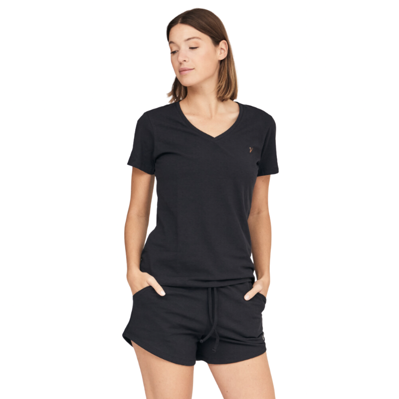 Vandalia diseñó esta remera de cuello escote en V para que te acompañe en tu día a día. Su tejido suave protege tu piel y te permite disfrutar de todos los beneficios del algodón mientras te sentís cómoda y lucís el mejor estilo. Confección a base de jersey algodón con lycra que la hace ideal para combinar elasticidad, suavidad y confort.