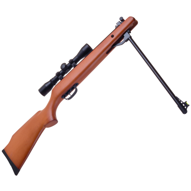 Fusil de aire comprimido de cañón abatible con pistón de resorte, diseñado para control de plagas y tiro al blanco. Con un cañón estriado de 15 pulgadas, alcanza velocidades de hasta 950 fps (289 m/s) con pellets de aleación y 800 fps (243.84 m/s) con plomo, ofreciendo precisión y potencia. Su culata de madera dura ambidiestra con cantonera de caucho proporciona comodidad, mientras que el gatillo ajustable de dos etapas y las miras de fibra óptica (delantera y trasera microajustable) aseguran un disparo preciso. Incluye una mira CenterPoint 4x32mm con montaje Weaver, pesa 2.95 kg y mide 109.2 cm, siendo robusto y elegante.