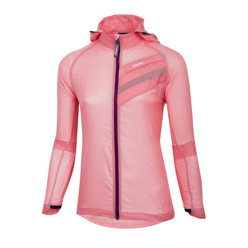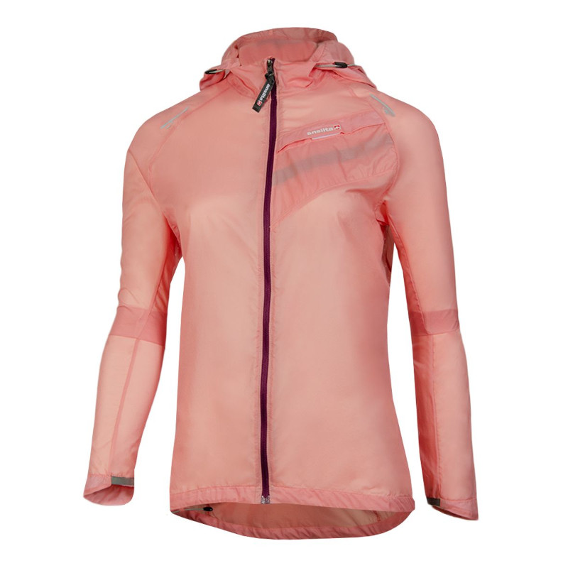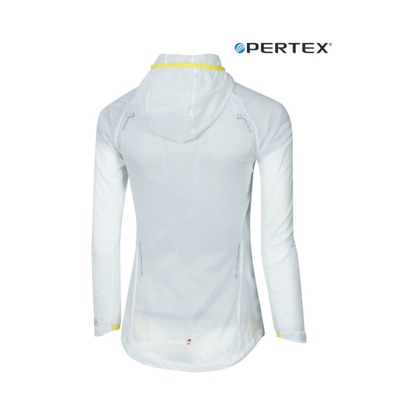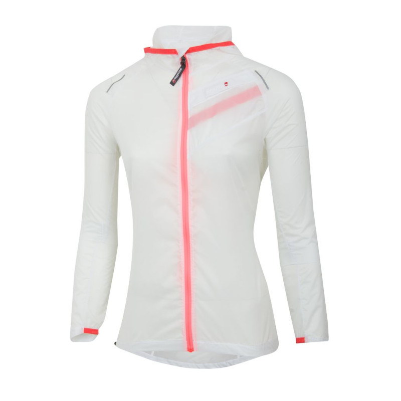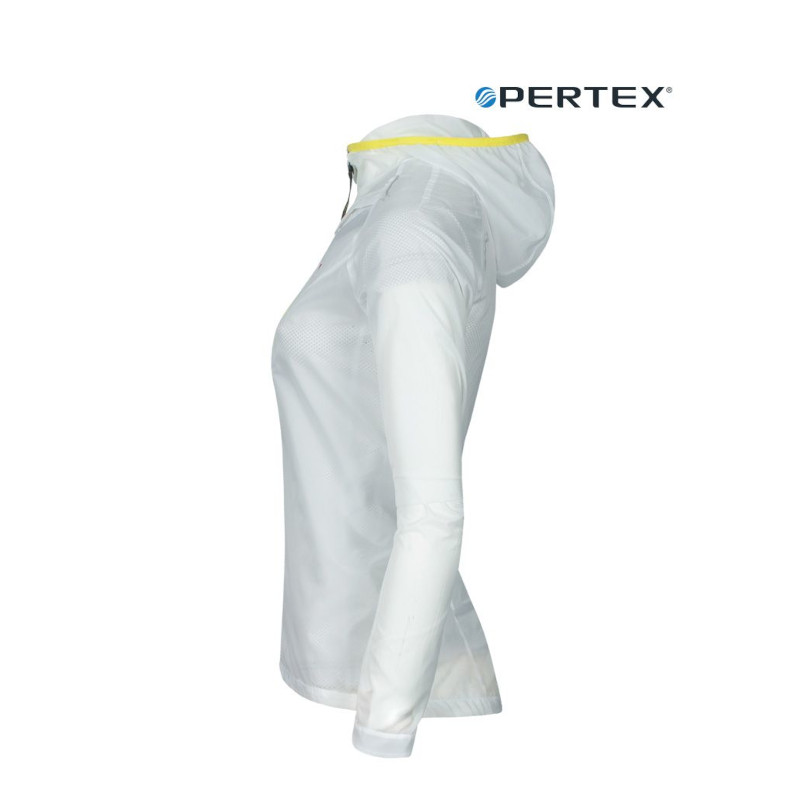Campera femenina ideal para llevarla dentro de un bolsillo o una riñonera durante la práctica de carreras de aventura, running o ciclismo. Muy liviana. Ofrece una gran resistencia al viento y es totalmente respirable. Confeccionada con tejido Pertex®