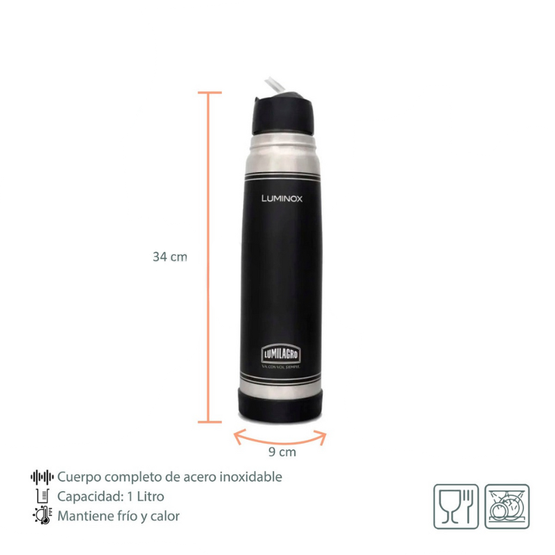 Termo de acero inoxidable con proceso de vacío exclusivo, garantiza una alta performance del producto y asegura el mantenimiento de temperatura por 12 horas.