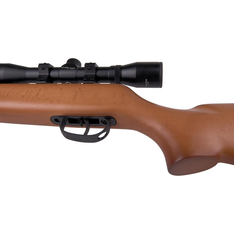 Fusil de aire comprimido de cañón abatible con pistón de resorte, diseñado para control de plagas y tiro al blanco. Con un cañón estriado de 15 pulgadas, alcanza velocidades de hasta 950 fps (289 m/s) con pellets de aleación y 800 fps (243.84 m/s) con plomo, ofreciendo precisión y potencia. Su culata de madera dura ambidiestra con cantonera de caucho proporciona comodidad, mientras que el gatillo ajustable de dos etapas y las miras de fibra óptica (delantera y trasera microajustable) aseguran un disparo preciso. Incluye una mira CenterPoint 4x32mm con montaje Weaver, pesa 2.95 kg y mide 109.2 cm, siendo robusto y elegante.